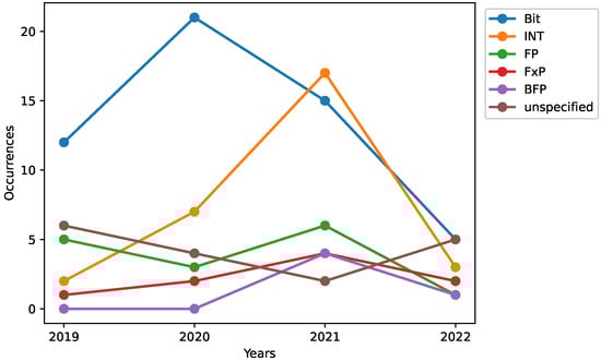 Li et al. [] published a short systematic literature review on ANN accelerators with a focus on DNN/CNN co-processors; CPUs integrated with the co-processor acting as the acceleration module for ANN acceleration. They observed that the representative numerical precision formats used were 8-bit integer and 16-bit floating point, and that the throughput varies from 100 GOPS to 10 TOPS.