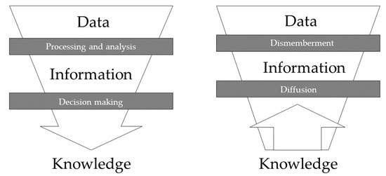 We emphasize the relevance of the hierarchy between data, information, and knowledge when applying the methods. The data, when processed and analyzed, become information. When such information is recognized and applied in decision-making, it generates knowledge. Similarly, the reverse hierarchy can also be applied since knowledge, when disseminated or explained, becomes information that, when dismembered, can generate a data set [9]. Figure 1 presents this logic, which is fundamental to MCDM.