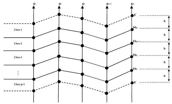 The authors obtain the bh thresholds considering the number of p profiles established by the DMs, dividing the interval between the maximum and minimum values of each criterion into p + 1 equal parts (classes) [70]. Be gj* and gj− the maximum and minimum values, respectively, presented by the alternatives in each criterion. The interval hj is defined between consecutive profiles by (7) and (8):