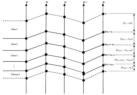 After setting the value of k, the bn profiles are obtained, such as bni = {bnp = ak, bnp−1 = a2k, ..., bn1 = apk}, where p is the number of profiles. The bnp profile represents the lower bound of the highest class (Class 1), and bn1, the upper bound of the worst class (Class p + 1). Figure 3 presents the establishment of class profiles obtained through the bn procedure:
