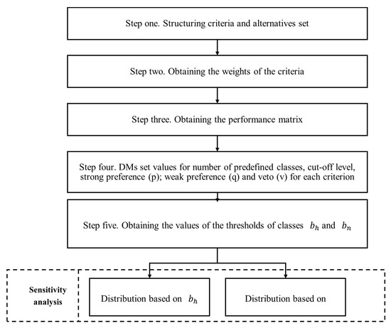 The ELECTRE MOr, proposed by [64], is a method of classification of multiple criteria with the input of ordinal weights, which includes multiple DMs, and distributes the alternatives into predefined categories. For the establishment of preference relationships, the method establishes three fundamental situations of comparison between alternatives and predefined class limits: