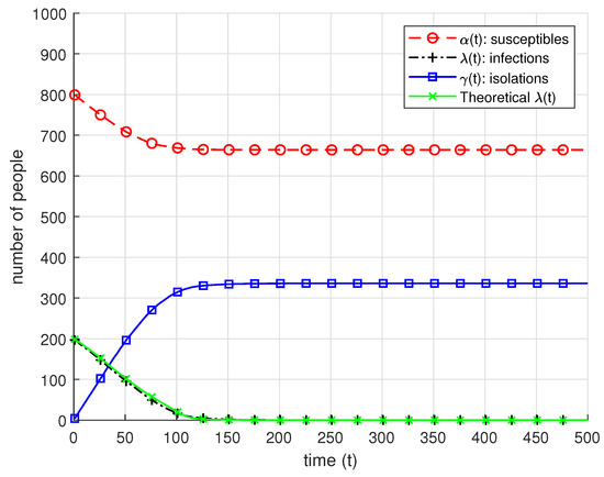 In Theorem 2, we characterize the -disease control time metric for dynamic individual testing algorithm. Since it is defined as the time instance when there are non-isolated infected individuals in the mean sense, -disease control time metric presents a characterization of how fast a given algorithm can control the disease spread.