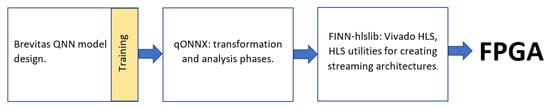 Since the interest of our work is oriented to build DL models that can be run on devices with limited computing resources such as FPGA, we focus on the Brevitas framework as it is the only framework that allows the design, development, and execution of QNN in FPGA [,,,,]. Figure 2 shows the workflow followed by Brevitas, where:
