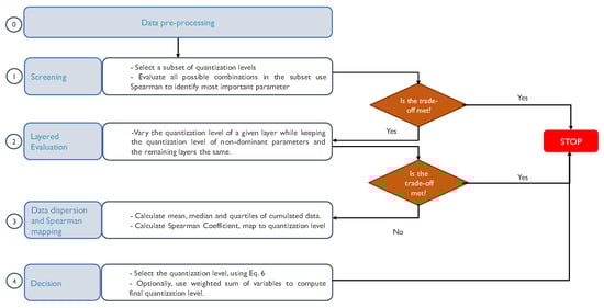Based on a fractional factorial design [], our methodology allows reducing the number of experiments concerning quantifiable parameters. We divide the methodology into four stages. After each stage, we measure the trade-off between the model’s performance metric (e.g., accuracy) and its inference cost (e.g., space in memory, number of operations) regarding the unquantized model. It is worth mentioning that it is possible to include a preprocessing of the input signals to reduce their size before applying this methodology, such as dimensionality-reduction methods or averaged filters. Figure 3 illustrates a detailed block diagram of the developed methodology.