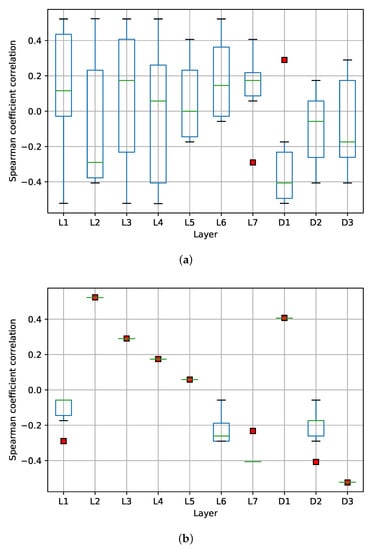 So far, we have analyzed the impact of only one layer in the trade-off. However, we may obtain a better model’s configuration by quantizing different layers using different quantization levels. Using the results from the previous stage, we analyze the data dispersion using the mean, the median, and the main quartiles per layer, per variable of interest (i.e., model performance metric and inference cost). At this point, the layer with higher dispersion is the layer that influences the trade-off the most. This allows us to analyze the behavior of each layer, but we still need to determine its level of quantization. To answer this question, we must correlate the information using Spearman. Since the Spearman’s correlation ranges from 1 to , we can obtain an equivalent scale for the quantization level. During the search, we identify the quantization level that, in general terms, offers a better trade-off. This quantization level is regarded as the highest Spearman’s correlation coefficient. Then, it is possible to obtain the quantization level and the direction, e.g., a 1 as correlation coefficient means that the layer must be quantized at the highest quantization level possible. In contrast, a as correlation coefficient means that the layer must be quantized with the lowest level possible.