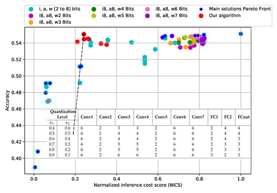 During the first stage, we identify the dominant parameter in the quantization. To perform this, we select a subset of representative levels and evaluate all the possible combinations over that subset (i.e., screening). That evaluation is made regarding the model accuracy and the NICS (i.e., the outputs). Accuracy is the ratio between the number of correct and the total number of predictions in all classes. The NICS calculation is obtained by comparing the weight bits, total activation bits, and BOPS against the reference model, as described in Equation (5).
