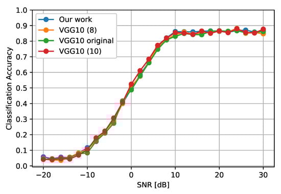 The authors of [] proposed a CNN architecture trained on the DeepSig dataset named RadioML Dataset 2018.01A, which has 24 modulation classes. The results indicated that the classification accuracy improves in the range of SNR from −4 dB to 20 dB. In [], the authors proposed a method that uses I/Q samples to form images with the “Stockwell discrete orthonormal transform”. Another technique is to perform transformations on the input I/Q samples to find other types of characteristics of the signal. Furthermore, it is possible to combine models trained on different datasets for better performance, such as in [], where two models from CNN were integrated into a single general model that allows more accurate classification of different modulations. However, this method is not computationally cheap since it does not use dimensionality reduction methods.