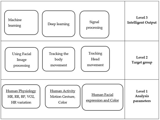 It has three levels of taxonomy; Analysis Parameters, Target Group, and Intelligent Output (See Figure 2). Level 1 is about the data collection or raw input data, which includes how and what type of data are collected to monitor the physical exercises. The second level includes input and output information focused for the target group. In particular, how the data collected in Level 1 is processed to obtain meaningful information. The third level includes some intelligent processing to obtain meaningful full information from the data collected from the subject. Machine learning and deep learning techniques are implemented at this level.
