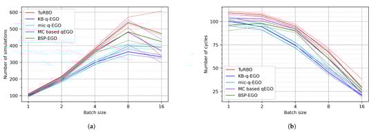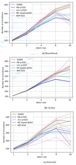 Figure 2a–c shows the number of simulations performed in 20 min as a function of the batch size. Since the evaluation time is the same, the difference is explained by the AP time (model learning excluded). A strong advantage of TuRBO is that its acquisition time is smaller than of other methods, it is observable in Figure 2 where we can see that TuRBO almost always performs more evaluations. However, it is also remarkable that increasing the batch size does not necessarily increase the number of evaluations in a fixed time. Indeed, the first explanation is that the data set is being supplemented with new points at each cycle, and it quickly becomes time-consuming to fit the model to the data. In addition, querying new candidates involves a bigger time cost when is big. Those two factors explain what we could call a breaking point: increasing the number of processing units does not increase the number of simulations or improve the final outcomes. The breaking point is visible for any method around . This is critical since we know that the relevance of large batches of points is lower than smaller batches [], and in this context, it is not compensated by more evaluations. Regarding Table 4, Table 5 and Table 6, the breaking point is noticeable by an increase in the average final cost when increasing the batch size. The latter observation is present for any approach, even TuRBO despite its good performance.