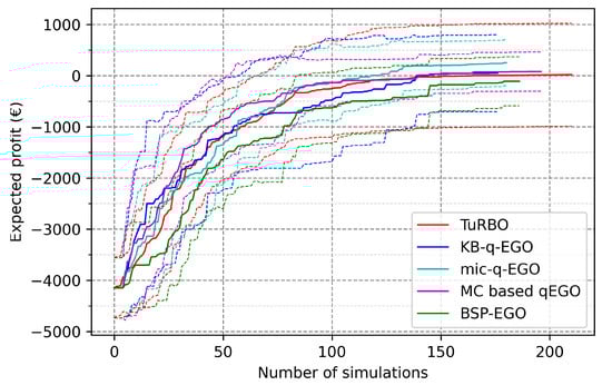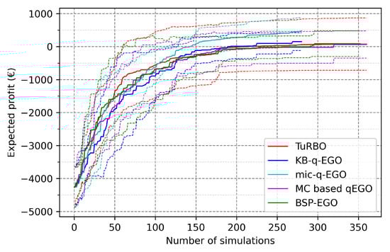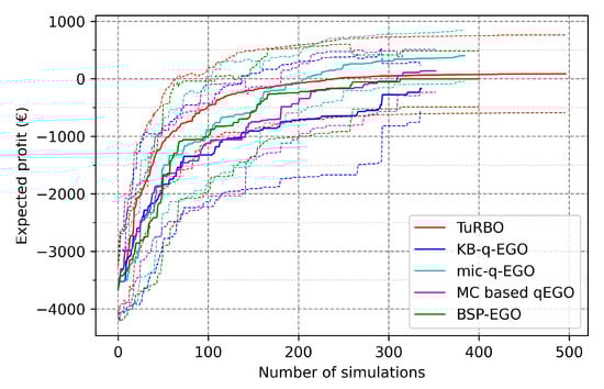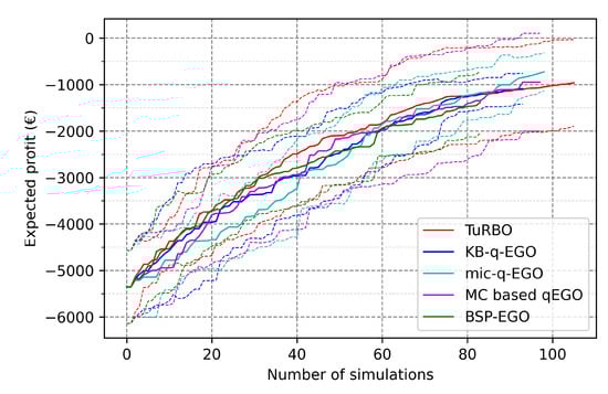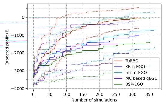 Looking at the final objective values in Table 7, we observe an improvement of the final average and worst-case profit, along with the increase of the batch size up to . Nevertheless, similar values are observed for compared to , despite the larger batch size and higher number of simulations. Additionally, regarding results with , we observe a clear deterioration of the final outcomes except for TuRBO results which remain equivalent to . The breaking point defined in the benchmark analysis is clearly visible also for the UPHES application. Except for TuRBO, seems to be the best compromise between speed of execution and quality of the candidates provided by the AP. Either by improving the average profit, the minimum value of profit, or reducing variance, TuRBO benefits from a larger batch size. Even though TuRBO is the only method managing to improve the quality of the final outcomes when increasing the batch size, it does not compete with mic-q-EGO () at any batch size.