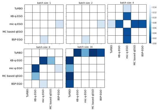 Finally, Figure 7 clearly illustrates different behaviors of the investigated algorithm when increasing the batch size to 16. While BSP-EGO and MC-based q-EGO have similar performances, the three remaining have not. Classical KB-q-EGO is again on average less efficient than its multi-criteria counterpart, and both of them are significantly () different from TuRBO.