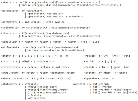 Figure 3. Simplified Java grammar that allows the emergence of the considered possible sub-concepts. - By using a grammar that forces the presence of the vulnerability that the model is trained on, we generate sets of individuals that minimize the fitness, and on these sets, we count the number of instances that are classified as vulnerable.