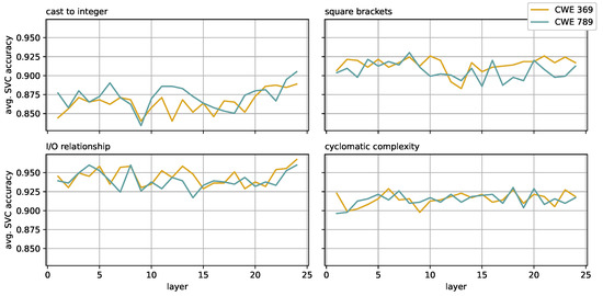 As outlined in Figure 4, we considered the feedforward layers of the encoder blocks, namely the dense layers that feed the succeeding encoder block. In the CuBERT transformer, there are 24 encoding blocks, each one composed by 1024 neurons with a 512-dimensional output. For each considered sub-concept, we started by collecting the activations obtained by flattening the output of the feedforward layers (see Section 3.2) for a balanced random sample, where 100 program instances were associated to the concept, and 100 did not represent it. Then, for both the fine-tuned models (i.e., the binary classifiers trained in the detection of the divide by zero and uncontrolled memory allocation vulnerabilities, respectively), and for each concept, we gathered the activations of the flattened layers as points of a -dimensional vector space, and for each of the 24 layers, we fit a linear support vector classifier (SVC) to correctly separate the points representing programs related to the chosen concept, and the points representing programs with no presence of the same concept.