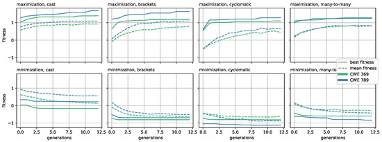 For the second measure of sensitivity we propose, based on the classification of instances which are generated by the DSGE evolutionary algorithm, we performed 16 experiments, each corresponding to a combination of choices for concept, CWE, and maximization or minimization of fitness, respectively, on safe and on vulnerable code. As a result, each experiment generated an overall population of around 2200 unique individuals, whose fitness ranges were polarized toward positive or negative values by the chosen optimization. Nonetheless we checked the values ranges, and they always included both positive and negative values, apart from experiments aiming at minimizing for CWE-789 the presence of “cast” elements in the input, where no individual with negative fitness value was generated (bottom-left box in Figure 7). We recall that having fitness values spanning both positive and negative values means that each experiment generated both individuals with the strong presence of a concept together with individuals with little presence of the same concept.