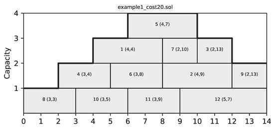 A concrete example involving 12 jobs and a capacity line that reaches a maximum of four units is presented below. This example is the one used as Example 1 in []. Table 1 summarizes information related to it alongside the values associated with an optimal schedule for this problem instance, achieving an optimal cost of 20. The schedule corresponding to the table’s third line is presented graphically in Figure 1.