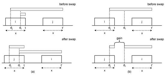 Suppose that two jobs, i and j, with the same duration, are scheduled such that job i comes first and job j follows. Additionally, suppose that job j has an earlier due time than job i, i.e., . Let t and be the finish times of jobs i and j, respectively, and since both jobs have the same duration, holds. When both jobs have non-negative tardiness values, i.e., and , swapping the jobs results again in non-negative tardiness values for both jobs. This holds because the tardiness of job j after the swap will be . Moreover, , so the tardiness of job i after the swap will be . So, the total tardiness before the swap is , which is equal to the total tardiness after the swap, which is . This situation is depicted in Figure 4a. The top figure shows a possible configuration of two equal-duration jobs that both incur tardiness. It can be easily seen that the total length of the gray bars that represent the tardiness remains the same after swapping jobs i and j.