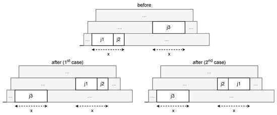 Assuming that job has the same duration as the aggregated duration of jobs and , two cases for swapping them become possible. The first one puts first and second, and the other one puts first and second.