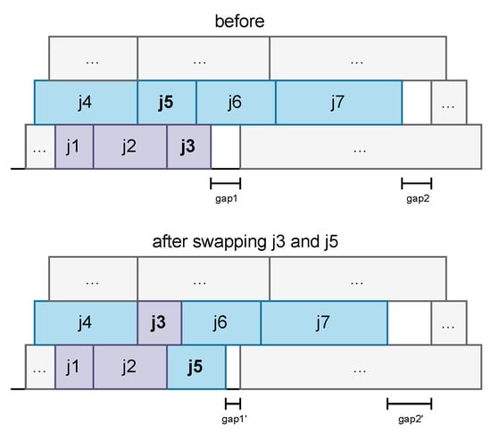 The first local search procedure starts by iterating overall jobs. For each job , each other consecutive job is identified, and then each job with a duration equal to the aggregated durations of and is found. Since and are consecutive, they can be swapped with job , and the schedule will still remain feasible, as seen in Figure 5. Moreover, the order of the two first jobs does not influence the feasibility. So, two alternatives are tested that compare the imposed penalties before and after the swap, and, if an improvement is found, the swap occurs. The time complexity of this procedure is since the maximum number of consecutive jobs for each job is bounded by the maximum capacity, which is a constant number much smaller than the number of jobs. Moreover, the identification of consecutive jobs and jobs of durations that are equal to the aggregated duration of two other consecutive jobs is performed using Hash Maps that effectively contribute to the above complexity. The first one uses times as keys and has a list of jobs starting at these times as values. By using as a key the finish time of a job , the dictionary returns each job that is consecutive to . The second Hash Map uses the jobs’ durations as keys and, as the value for each key x, the list of jobs with the duration x. Note that the second Hash Map is computed only once and remains unchanged through the solution process.
