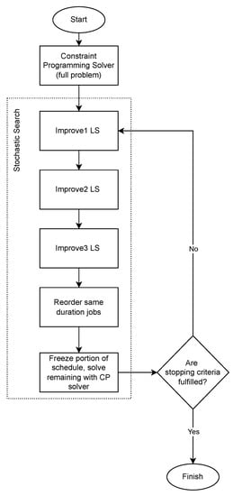 The HELS (hybrid exact–local search) approach is shown using the flowchart in Figure 8. First, the constraint programming solver is employed for the full problem. A period of time of seconds is given for executing this stage. Then, for seconds, a loop occurs that includes the three local search procedures, followed by activation of the constraint programming solver again, but this time for subproblems. These subproblems might involve jobs that intersect with vertical ribbons on the time axis or groups of consecutive sequences of jobs (i.e., multiple C-Paths). Note that a reordering of jobs might be needed so that the current solution conforms with the “due rule”, else the constraint programming solver might consider the fixed parts of the partial solution to be infeasible. This is denoted by the extra stage “Reorder same duration jobs” after the third local search procedure in Figure 8.