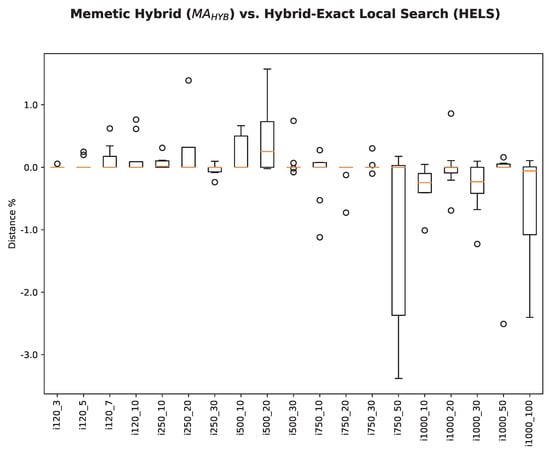 Table 6 consolidates the relative performance of our approach when compared with the best-known results. We can observe that our approach manages to find new best results for 48 of the problem instances. It also equals the best-known results for 91 problem instances. achieves better results than our approach for the remaining 51 problem instances. We also compare our solutions with how closely it reaches the previously best-known solution as a percentage value, and we call this the metric “distance%”. Negative values mean that our approach sets a new best-known value. We see that the average distance% metric for all problem instances assumes a negative value of , demonstrating its very good performance. This is further supported by Figure 9, which shows for each problem subset consisting of 10 instances, a boxplot of the distance% values. Again, negative values are advantageous for our approach, and the graph clearly shows that our approach achieves excellent results, especially for large problem instances.