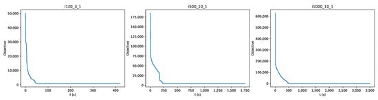 Regarding comparing our approach with the one by Mencia et al. [], we can make a few remarks. First, Mencia et al. do not report in their papers the exact values that their approaches returned; instead, they compare their results to their other less efficient approaches. So, we retrieved the values we use in our comparisons from the site [] that the authors reference in their paper. Providing exact values alongside solution files that other researchers can download from our repository [] may attract more interest to the problem. Since the run-time environments used in our case and in Mencia et al.’s case are different, we focus mainly on whether each approach can find the best possible result, given that limited processing power is exploited in both cases. Furthermore, in our case, Figure 10 clearly shows a trend observed in other problem instances: our approach reaches results very close to the final results using only about of the allotted execution time.