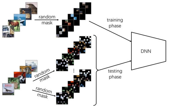 Define as a masking operator, where C is a predefined set which has its cardinality depend on the number of grids that cover the input. For example, masking a image by using grids gives possible ways of masking (2 possibilities for each grid, i.e., to apply masking or not to apply masking. The image is divided into grids), so that in this case one may set . An extreme case is that all grids are masked, but this can hardly happen as we pick up grids probabilistically. Suppose the original classifier is trained with sample set Z, and we use the sample set to retrain the existing structure into a new DNN model that is used to “simulate” the performance of , in the sense that given , so as to enhance the robustness of the model. At the same time, the attacker needs to generate effective adversarial noise for each image in , which increases the difficulty of the attack and reduces the effect of the attack.