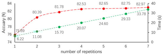 The red line shows the relationship between test accuracy and number of repetitions for masked images from CIFAR-10, and the green line shows the amount of time (in seconds) that is required to test 10,000 images.
