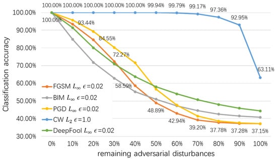 In order to measure how much the effect of adversarial inputs is weakened by masking, we conduct another preliminary study by randomly removing part of the perturbation vector from an adversarial input. We first train a VGG16 model on CIFAR-10 data set by using the conventional method. Then, given adversarial samples generated from clean samples, we obtain each perturbation vector by taking the difference between an adversarial input and its corresponding clean image. These vectors are then randomly masked before adding back to the clean images to form a set of weakened attack samples. The relationship between the model accuracy and the proportion of the remaining adversarial disturbance is shown in Figure 3, where remaining adversarial disturbance represents strength of the original adversarial inputs, and remaining represents the adversarial inputs with of the perturbation dimensions removed. In particular, we find that the CW attack is more sensitive to this perturbation removal operation, which may be due to the fact that CW generates smaller perturbation with higher relevance. For most other attacks, we find that removing at least of the perturbation (i.e., at most of the attack perturbation remaining) is required to deliver significant improvement regarding classification accuracy.
