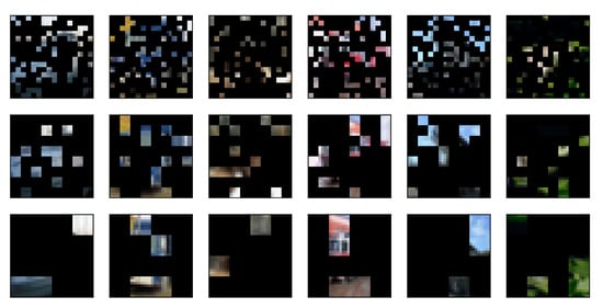 Images from CIFAR-10 with different masking rates applied. From top to bottom, , , and rates are respectively applied on the same images.