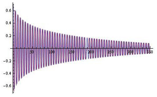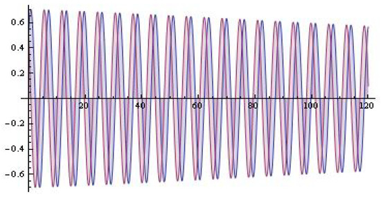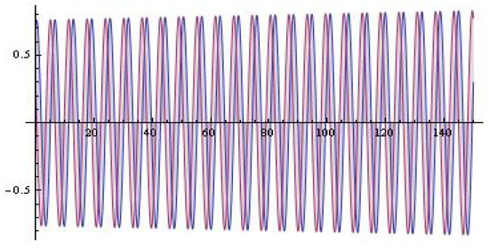 For an proper choice of the parameter (for example ), we have a limit cycle and limit cycle with multiplicity 2 (see Table 2). The solution of the system (8) for , , with , is visualized in Figure 9.