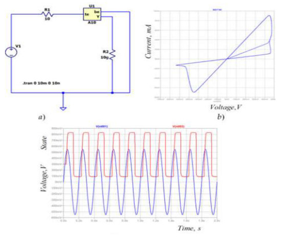 A simple circuit for testing the memristor model and corresponding current–voltage characteristics [11].