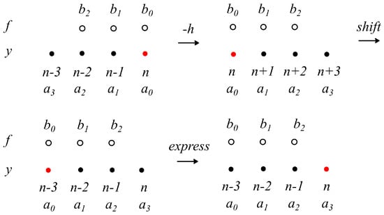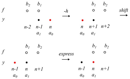 One can see that adjoint (10) is not a linear multistep method because it possesses single implicit dependence from , similarly to conventional implicit methods, and one additional implicitness from . Some researchers call such dependencies “super-future points” []. Methods of this type were firstly obtained by Cash to increase the stability region of backward differentiation formulas and are usually applied as predictor-corrector schemes with several predictors []. Of course, adjoints can be easily applied to ODE in a form and in that case can be indistinguishable from their counterpart due to their symmetric nature.