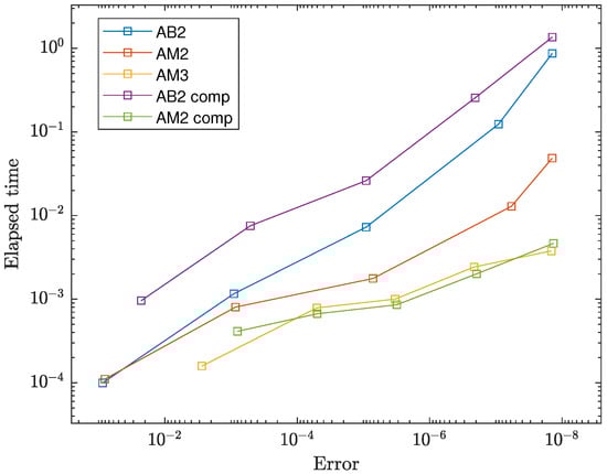 Proposed composition schemes were compared with methods-predecessors and the 3-step Adams-Moulton method of fourth order. With exception of the two-step Adams-Bashforth method, the Newton method was applied to resolve implicitness in all cases. In Figure 5 one can see that the composition scheme based on the two-step Adams-Bashforth method possesses very low efficiency in comparison to its predecessor despite better accuracy due to the Newton method’s extra computational costs. Nevertheless, the composition scheme based on the two-step Adams-Moulton method appears to be more efficient than the two-step Adams-Moulton method and has the same computational efficiency as a popular 3-step Adams-Moulton method, which makes it suitable for practical application.