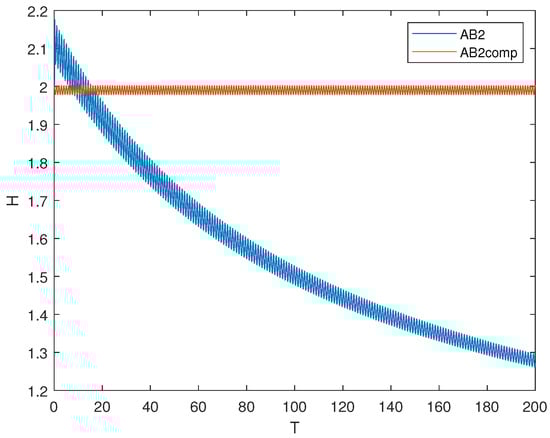 Hamiltonian of system (24) solved by two-step Adams-Bashforth method (AB2) and composition scheme based on it (AB2comp).