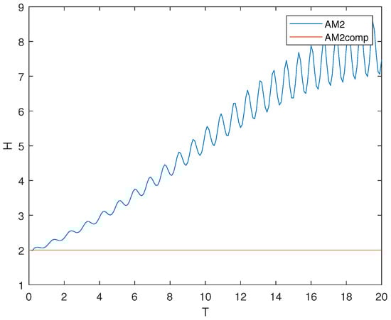 Hamiltonian of system (24) solved by two-step Adams-Moulton method (AM2) and composition scheme based on it (AM2comp).