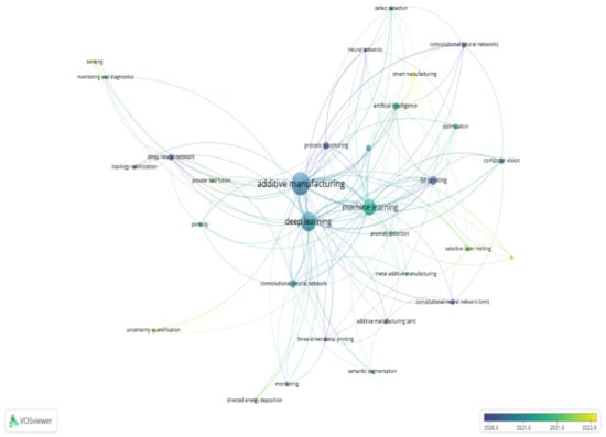 Immense effort has been made while collecting articles from various well-known databases such as (i) Google Scholar (ii) ScienceDirect, and (iii) IEEE Xplore. The various keywords used for the searches were: additive manufacturing (AM), deep learning (DL), Industry 4.0, design for additive manufacturing DFAM, big data, Internet of Things, computer vision, data security, explainable AI, trustworthy AI, federated learning, digital twins and sustainability. To focus on the goal of literature evaluation, the key technical terms were merged to obtain pertinent research study resources. The prominent academic search engine provided the majority of the research materials. The various research articles related to this field were gathered, and co-occurrence analysis was conducted using VOS viewer []. The network, co-occurrence, and density visualization of various keywords associated with it are shown in Figure 3. It is well illustrated in Figure 4 that the density of additive manufacturing and deep learning is more correlated than machine learning. Any new manufacturing technique needs early adopters or champions in the customer community to be adopted for widespread use. In the early 1990s, AM experienced the same thing. The early adopters, Dick Aubin at United Technologies, Pete Sferro at Ford Motor Company, and Clint Atwood at Sandia National Laboratory, were the key players in this technique []. This idea is emerging because of the significant degree of design flexibility AM technology offers. Design for additive manufacturing (DfAM) techniques or instruments are required to benefit fully from the unique skills offered by AM processes []. DfAM is a general term for design techniques or tools that allow the capabilities of additive manufacturing technology to be fully utilized to enhance functional performance and other significant product life-cycle aspects, such as dependability, manufacturability, and cost []. Due to its theoretical ability to produce more complex parts in any shape without requiring more work in the manufacturing processes, AM is given more design freedom. A consolidated view of incorporating an additive manufacturing process chain with deep learning has been illustrated in Figure 4. It demonstrates that quality control can be implemented in a very efficient manner in synergy with deep learning. From the beginning to the end of RP, data generation and input play a significant part in the AM process. Throughout this process’s exclusive design and production cycle, enormous amounts of data are generated. To optimize the AM process and make the process more efficient and dependable, this data must be gathered and examined. Diverse research teams have attempted experiments combining deep learning techniques with AM to enhance product quality, detect and forecast various flaws and distortions in the made part, optimize process times, and cut costs [].