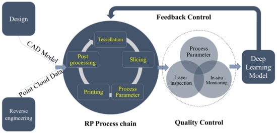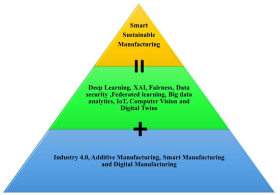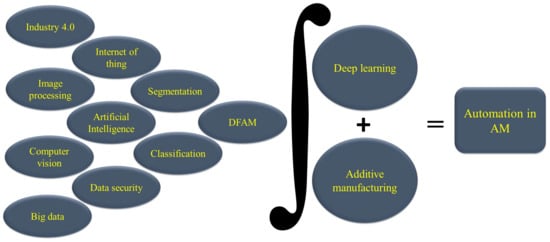 Industry 4.0 uses the fusion of advanced information technology and intelligent industrial systems. Due to its many advantages, including time and material savings, quick prototyping, high efficiency, and decentralized production techniques, AM is a critical component of Industry 4.0 []. These encompass a number of the most recent technical advancements, including artificial intelligence, cloud computing, digital twins, the Internet of Things, and cyber-physical systems. The word “AM” is also used to refer to several industrial processes that enable the production of things by stacking layers on top of one another. Numerous studies and applications of these technologies have been conducted to create homogenous and heterogeneous items with intricate geometries []. Intelligent production systems and cutting-edge information technologies are being encouraged to integrate through the implementation of Industry 4.0. This new movement is believed to necessitate AM, which is considered a significant element []. The primary drawback of AM-manufactured parts is their lower strength and related quality, together with the expensive cost of the printing technology. The industry can manufacture novel products with this disruptive technology, which can address various issues in the future production system. Additive manufacturing is a new paradigm that will be utilized by Industry 4.0 to accomplish the necessary objectives in this futuristic manufacturing system []. Therefore, a consolidated view of the respective technology leads to the integration of this new field viz additive manufacturing and deep learning. This has the potential to lead the automation in Industry 4.0 sustainably. A representative diagram is shown in Figure 5.