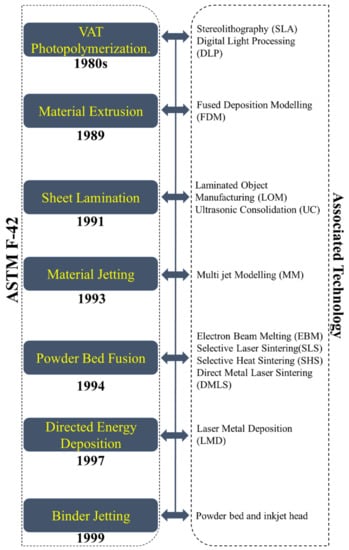 Additive manufacturing is growing and expanding with a wide range of technology and applications. According to ASTM F 42, additive manufacturing has been classified into seven categories, shown in Figure 6 with the associated technology []. There are quite a few different techniques, tools, and materials included in each of the seven process categories that additive manufacturing technologies fall under, and they may be used to meet the requirements of a broad range of industries, from aerospace to healthcare. Defining the mechanical characteristics of the final part is a necessity in industrial domains, along with certification of the personnel participating in each manufacturing phase, the product design stage, and so on [].