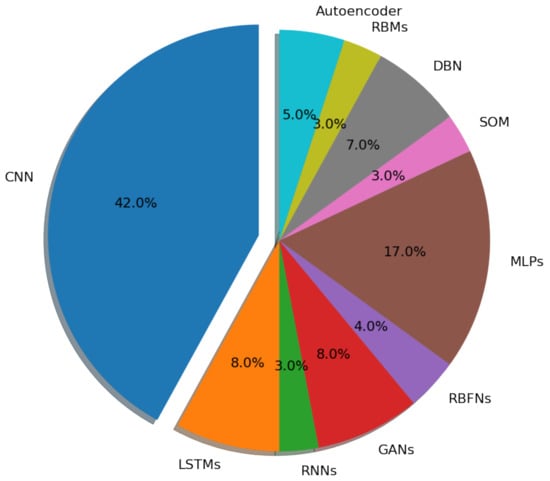 Convolutional neural networks are one of the deep neural network types that have received the most attention. Because of the rapid development in the amount of annotated data and considerable advances in the capacity of graphics processor units, convolutional neural network research has quickly developed and achieved state-of-the-art outcomes on several applications []. CNNs are made up of neurons that learn to optimize themselves, similar to traditional ANNs []. CNNs are frequently used in academic and commercial projects due to their benefits, such as down sampling, weight sharing, and local connection. A CNN model typically requires four components to be built. Convolution is an essential step in feature extraction. Feature maps are the results of convolution. We will lose boundary information if we use a convolution kernel of a specific size []. Padding is thus used to increase the input with a zero value, which can modify the size indirectly. Furthermore, the stride is employed to control the density of convolving. The density diminishes as the stride size increases. Feature maps generated after convolution contain many features, which might cause overfitting. Pooling (also known as aggregation) avoids redundancy []. The basic architecture of CNN is presented in Figure 9. Table 4 provides a summary of various literature on CNN. The deep CNN was accepted as the winning entry in the ImageNet Challenge 2012 (LSVRC-2012), developed by Krizhevsky, Sutskever, and Hinton. Since then, DL has been successfully used for several use cases, including, text processing, computer visions, sentiment analysis, recommendation systems, etc. Besides that, big businesses like Google, Facebook, Amazon, IBM, and others have established their own DL research facilities []. In addition to that, AM has also incorporated it enormously. As shown in Figure 8.