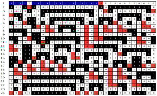 The dynamical law or the rule for updating the status of agents is synchronous, local, and universal. The status of all agents is updated at the same time, during each iteration. All agents use the same status-updating rules. The rules are local and represent variations of Wolfram’s Cellular Automata rules [,], in particular Rule 110. Rule 110 is an elementary cellular automaton that describes the status of a cell across several iterations based on the status of its immediate neighbors. The outcomes of this rule are 01101110, which is the binary equivalent of 110.