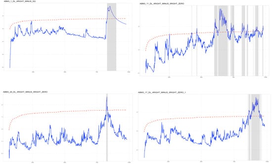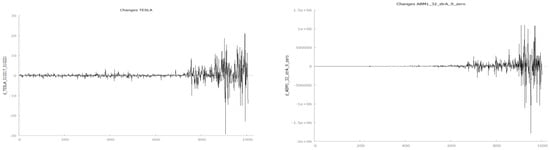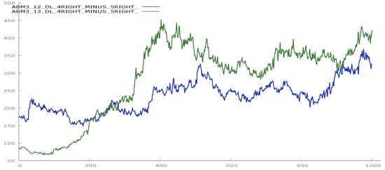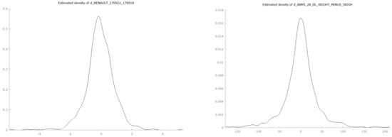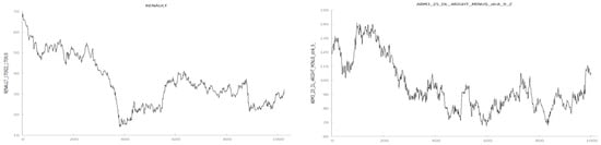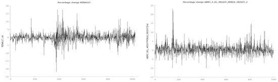 Not all first-order differences have similar distribution characteristics. The ones who look just like real data have first-order distributions that are undistinguishable from those of real data. Also as expected, none of these distributions are normal. Tests for normality have been performed, but they are not reported here. We have decided to run pairwise non-parametric tests instead, and failed to reject the null hypothesis in all but six instances. We do not report all results, however. For example, first-order differences of Renault’s stock price are compared to those of ABM3_28_DL_4RIGHT_MINUS_5RIGHT_Z. The Wilcoxon signed-rank test (H0: the median difference is zero) returns a z = 1.41216 and a two-tailed p-value of 0.157904, thus failing to reject the null hypothesis that the two distributions share the same location. The visual inspection of return time series shows the familiar pattern of volatility clustering and suggests the series are not variance stationary (Figure 8).