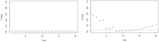 In the case of real time series, the tests reject the null at all lags except for Renault, where we reject the null only for the lags 8 to 13 (Figure 9). In the case of simulated time series, we find that all 42 series that bear close resemblance to real data exhibit the same pattern of heteroskedasticity.
