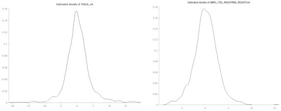 The return distributions show the familiar leptokurtic shape for both real market and simulated data (Figure 10). As expected, return distributions are not normal. We run normality tests, but we do not report the results here. Excess kurtosis ranges from 4.92 for Tesla to 16.42 for Carnival and from 1.17 to 283 for the simulated data. The median excess kurtosis for simulated return distributions is 2.89. Clearly, there is a wider variability in the shape of simulated distributions, but all 42 real-data look-alikes are leptokurtic. Yet again, our real data benchmark is made of only five stocks.