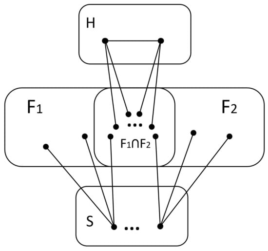 Since and are undistinguishable, they do not comply with Lemma 1(1). Thus, for any vertex h in H, we have . We infer that . Since is a g-extra fault set, it can be obtained that every component has . Similarly, is a g-extra fault set, and every component has . In summary, every component has . Since is a g-extra fault set, we have . Therefore, is a g-extra vertex cut (see Figure 4).