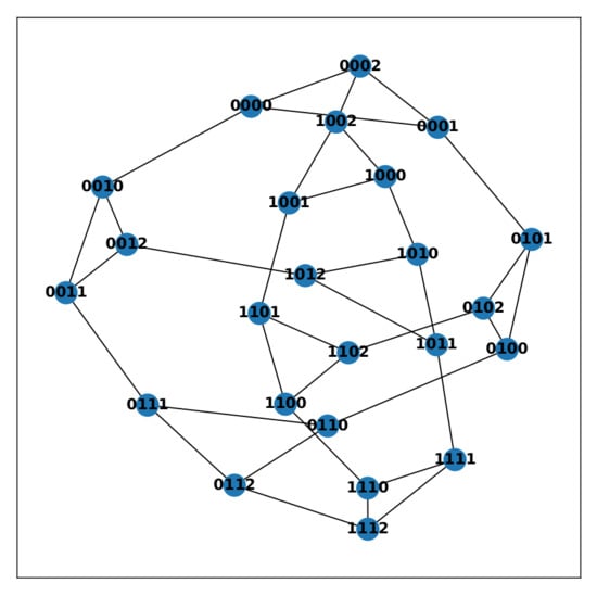 Given the network (see Figure 5), first execute the C-UC(u) algorithm. Based on , the algorithm randomly generates four faulty nodes, including 1110, 1100, 0012 and 1011. When the algorithm executes Nth times, the largest connected component is chosen to start from the node 0000. Breadth-first Search is used to put it in the set C. The largest connected component is shown in Figure 6. C = 0000, 0001, 0002, 0010, 0101, 1002, 0011, 0100, 0102, 1000, 1001, 0111, 0110, 1102, 1010, 1101, 0112, 1012, 1112, 1111. Meanwhile, UC = 1110, 1100, 0012, 1011. So, all faulty nodes have been diagnosed. There are no undiagnosed nodes.
