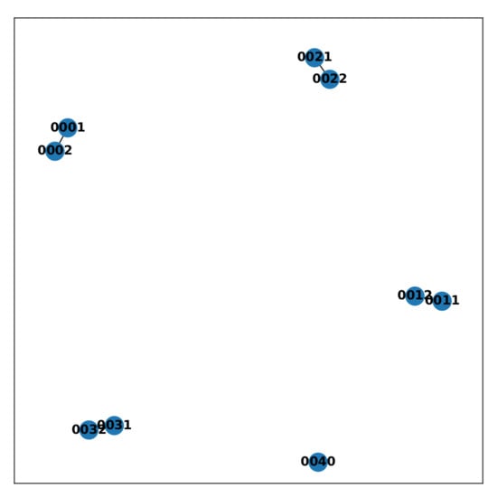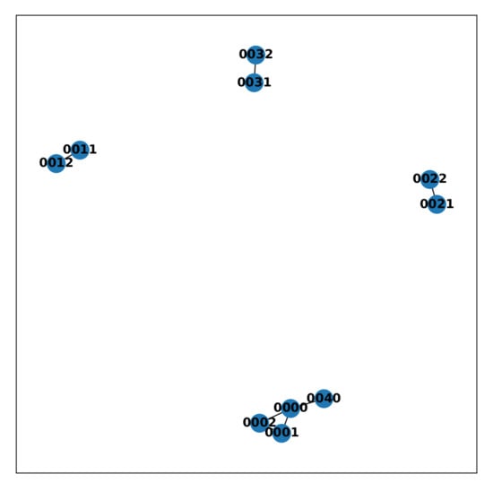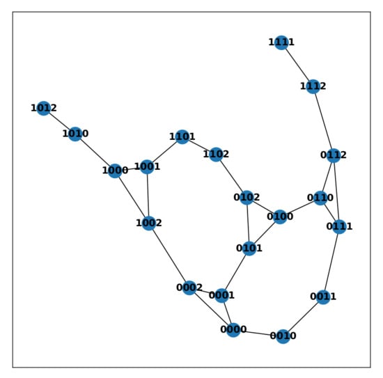 Given the network , we let , at which point . The selected fault nodes are 0000, 0001, 0011, 0002, 0012, 0021, 0031, 0022, 0032, 0040. Figure 7 shows the largest connected component obtained after the breadth-first search. Figure 8 shows the faulty nodes from the breadth-first search. It can be obtained that all the faulty nodes are tested except 0000. At this point, it satisfies and . After calling the UDiag(C,UC,U) algorithm, 0000 is diagnosed as the faulty node (Figure 9 shows the set of fault nodes). So, all faulty nodes have been diagnosed. There are no undiagnosed nodes.