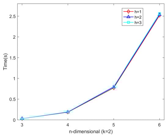 Next, we give experimental results for the execution of the t/h-Diag algorithm. Simulation experiments were performed on computers with Intel Core i7-11800H, 2.3 GHz, 16 GB DRAM, 64 bit Windows and x64 processor. The programming language was Python. Let be the target network, with , and . In addition, we randomly selected faulty nodes in by executing the algorithm 500 times and then calculating the single average time.