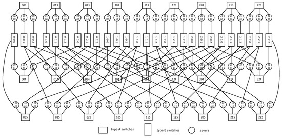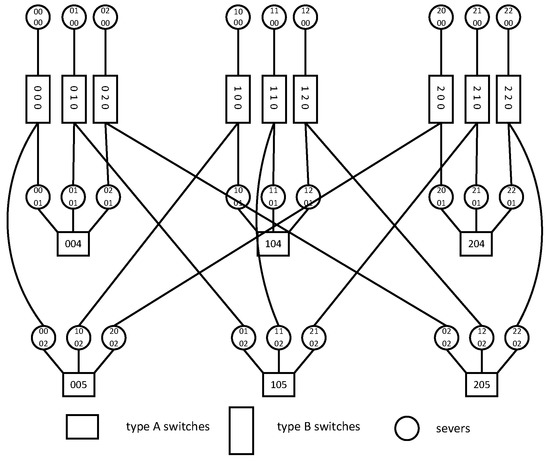 The BCCC structure connects servers by using recursively defined squares. In , n denotes the n-port server and k denotes the dimension. First, we let n servers connect to an n-port switch as an element, denoted by BCCC(n,0). BCCC(n,k) is composed of n BCCC(n,k−1)s connecting elements. Two types of switch are used in BCCC, which are the type A switch and type B switch. A type A switch has n ports for forming an element and a type B switch has ports for connecting different elements. Any server x in BCCC(n,k) can be represented by and . Any switch s can be represented by and . Overall, to build BCCC(n,k), we need dual-port servers, type A switches, and type B switches. An example of is shown in Figure 1.