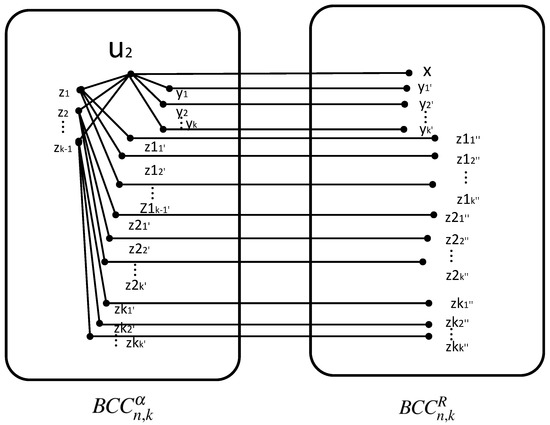 According to the construction rules of BCCC, U is set as the point adjacent to in to reach the conclusion that the point set of U is located in the same type A switch of subgraph and has no neighbors. Therefore, the point in the set of U points is the one with the fewest neighbors in . These vertices have k vertex disjoint paths in the subgraph. This achieves . Moreover, for any vertex x in to connect to , one of x’s neighbors in the same type A switch is not in the subgraph. Therefore, .