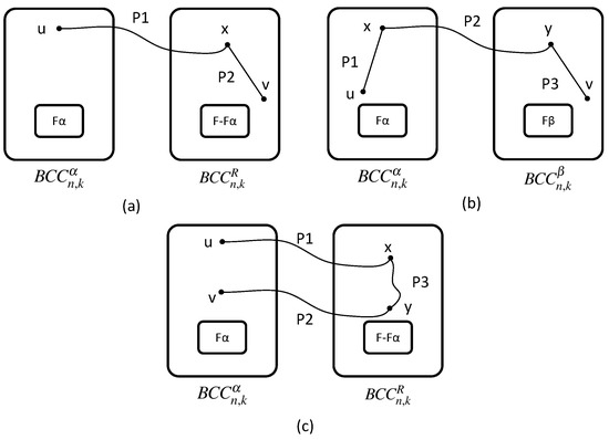If u and v are adjacent, the theorem holds. Hence, we discuss the case that u and v are not adjacent. According to the structure of BCCC, BCCC can be divided into n subgraphs. Let for be the subgraph of G. Furthermore, , for . Let and . Let , be a subgraph other than in G and . If , u is named as . Otherwise, u is named as .